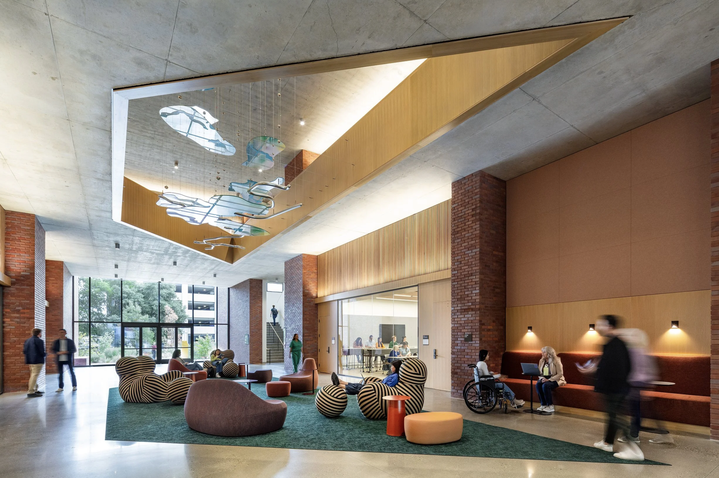 Aggie Square is a vibrant hub of innovation, research, and engagement located within the U.C. Davis campus. The design of the lobby’s hero sculpture, Data Delta, honors the convergence of the Sacramento River and its surrounding landscape–a constant flow of change. The painted panels suspended above the reflective river represent the area’s topography, and the gradient color maps the local land use.